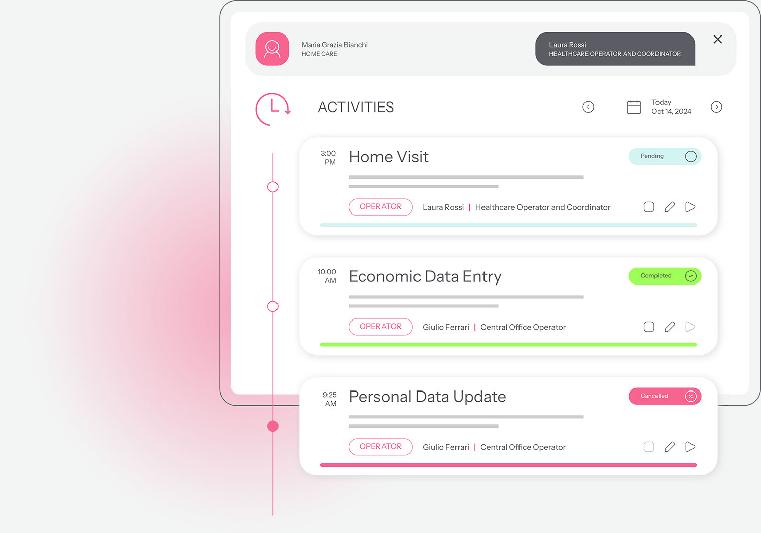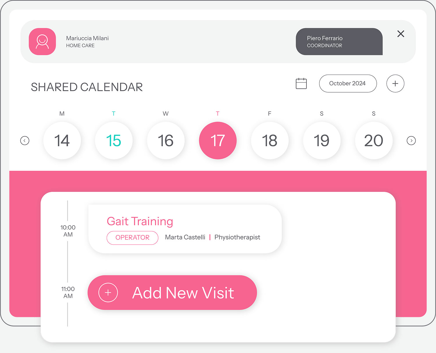 Tasks and workloads are updated in real time in a shared calendar that is able to schedule daily, weekly, and monthly home care visits. The calendar is equipped with filters, and access planning can be handled either autonomously by individual professionals or centrally by the coordination staff, who can monitor care plans at any time.