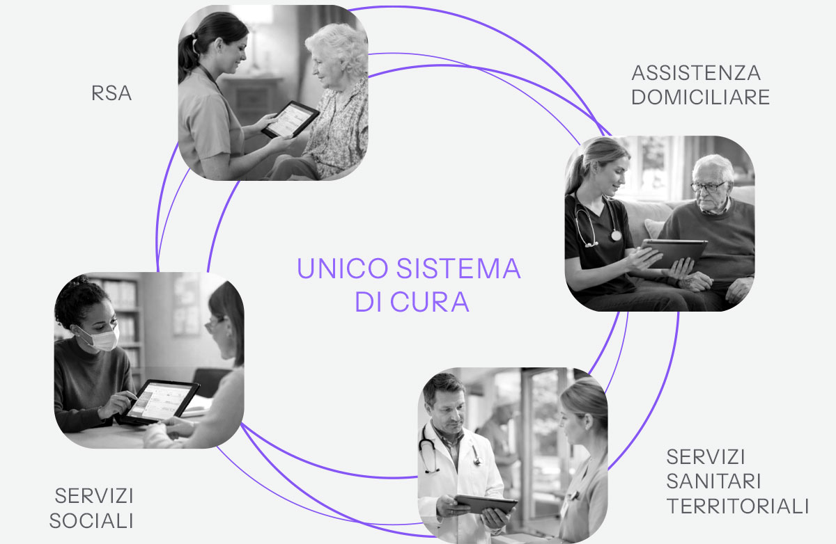 un approccio che guarda ai modelli più evoluti del welfare europeo per sviluppare soluzioni software per RSA e assistenza domiciliare (C-Dom, RSA Aperta e UCP-Dom) capaci di integrare processi, dati e persone.